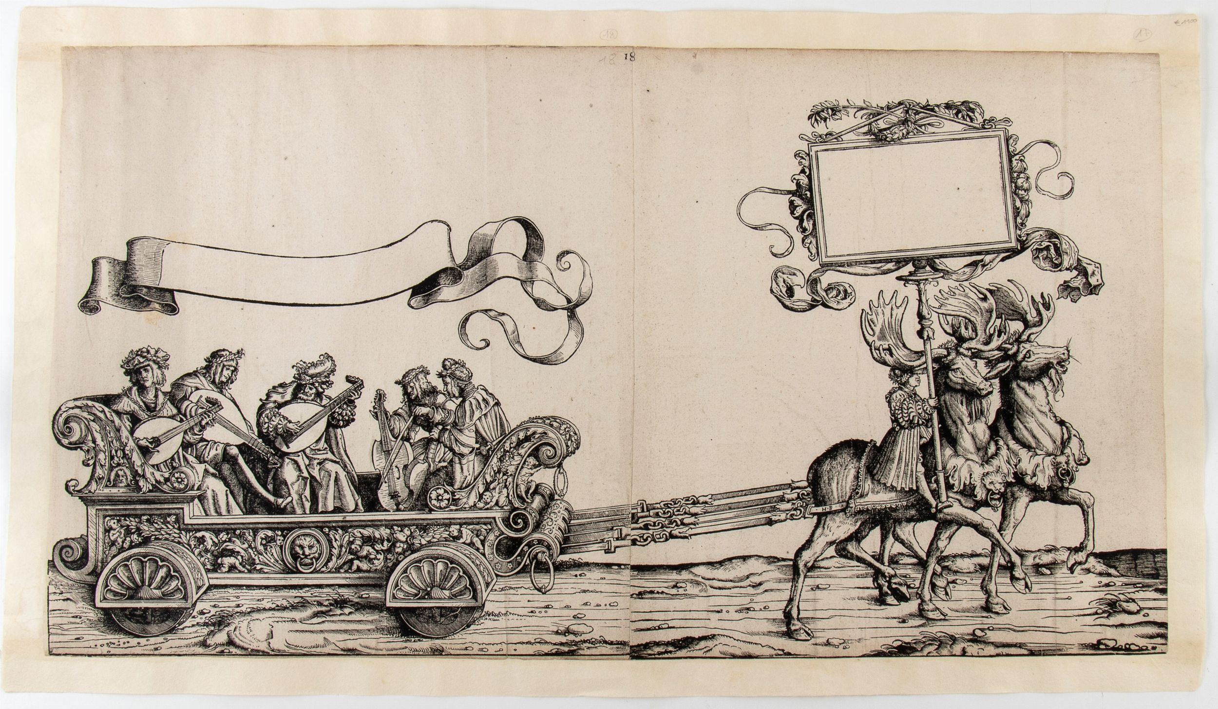 Xilografia, 390 x 345 mm ca. (cad. foglio). Tavole n. 17 e 18 del set di 139 lastre che compongono un fregio di circa 54 metri, raffigurante una processione trionfale allegorica in onore di Massimiliano I (1459-1519), Sacro Romano Imperatore. Tiratura del XVIII secolo. Due fogli uniti. Molto bella impressione su carta vergata con filigrana (Lupo nello scudo incoronato con le lettere 'IAV' e 'WOLFEG'; Germania, circa 1760 - 1788). Esemplari rifilati con i margini ricomposti.