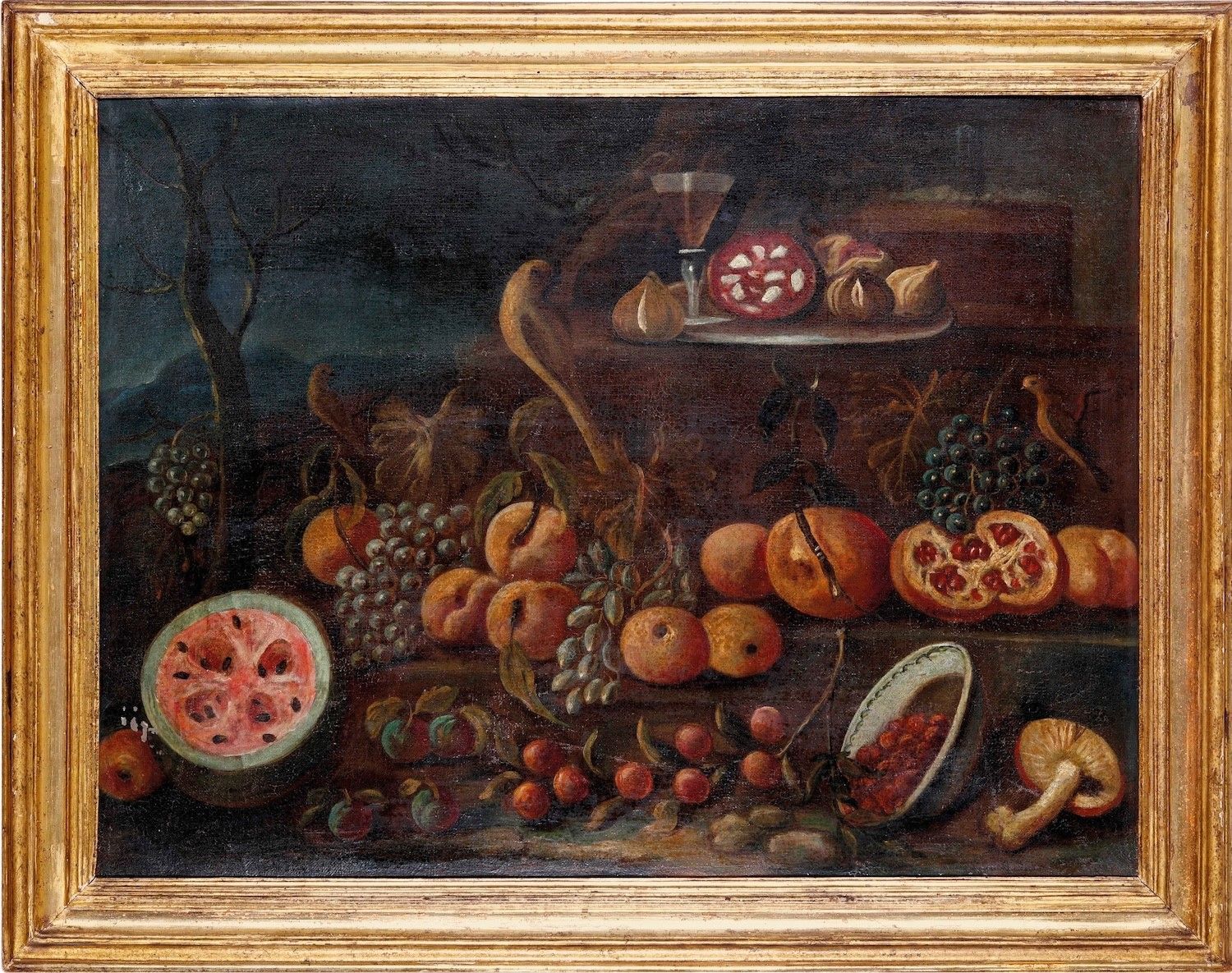 Scuola romana del XVIII secolo Natura morta con frutta, funghi e uccellini