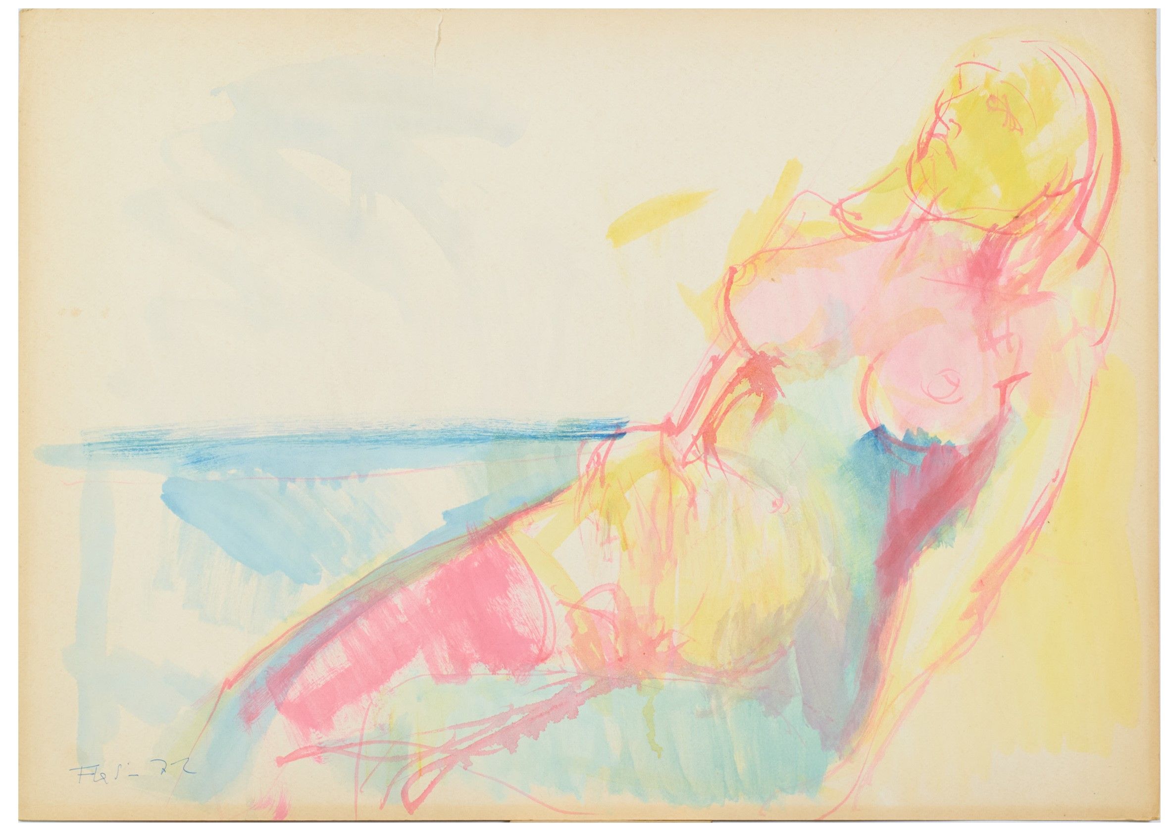 Firma in basso a sinistra. La carta presenta difetti, strappo in alto a sinistra.