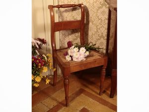 h cm 85x45x39 metà del XIX secolo schienale con cartella traforata, sedile impagliato, gambe anteriori tornite, [..]