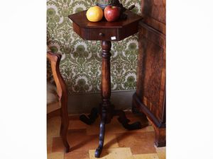 h cm 80x40 metà del XIX secolo piano di forma esagonale con cassettino nella fascia, sostegno centrale su tre [..]