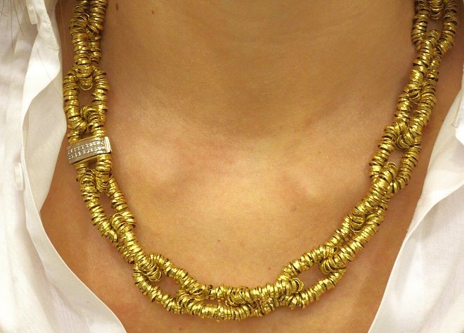 Di grande pregio anche una collana in oro 18 Kt, chiusura con 40 brillanti, di manifattura fiorentina. La sua base d'asta è di 14.000 euro.