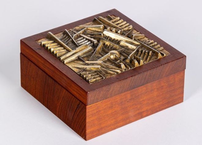 Anche la sezione dedicata alla scultura presenta opere di forte impatto. Tra queste, "Scatola per Ciga Hotels" (1980) di Arnaldo Pomodoro (Morciano di Romagna, 1926 – Milano, 2025), stimata tra i 1.800 e 2.500 euro, esempio significativo della sua ricerca sulle forme geometriche e sulla materia.