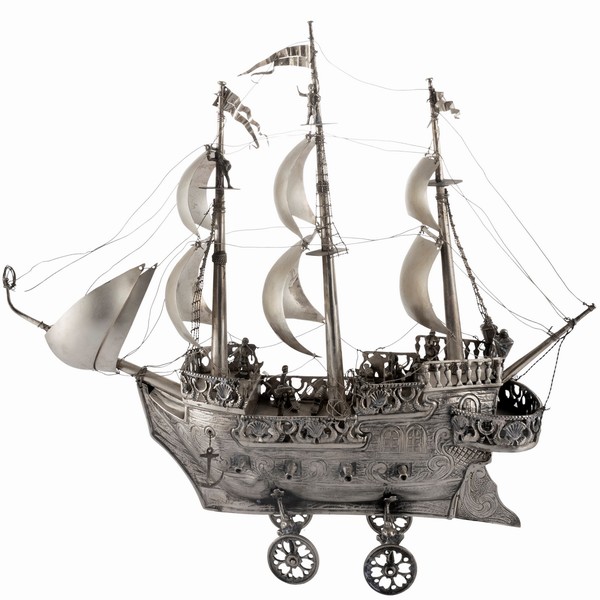 Le collezioni presentate non sono semplici allestimenti, ma mise en scène pensate per suscitare emozione e suggerire uno stile di vita. Tra i lotti più prestigiosi spicca un sontuoso servizio Hermès “Balcon du Guadalquivir” (lotto 175), dal decoro rosso imperiale ispirato all’architettura andalusa. Stima: € 6.000 – 8.000.Segue una raffinata coppa in argento a forma di conchiglia Nautilus, decorata con motivi marini. Stima: € 1.500 – 2.500. Grande curiosità anche per un galeone in argento (lotto 29), modellato con straordinaria precisione artigianale: un piccolo capolavoro che un tempo troneggiava al centro delle tavole nobiliari. Stima: € 1.000 – 1.500.