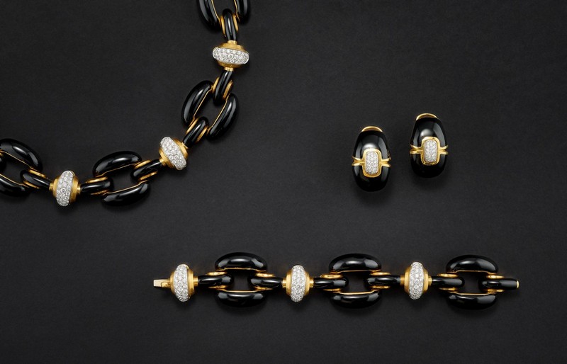 "Parure” è la parola chiave dell'appuntamento di Finarte dedicato ai Gioielli Importanti. Fiore all’occhiello sarà una preziosa collezione firmata David Webb: un’importante parure in oro bicolore con smalto nero e diamanti, composta da collana, bracciale e orecchini (Lotto 202, base d’asta € 32.000), affiancata da una collana sautoir in corniola e oro giallo (Lotto 485, base d’asta € 12.000).