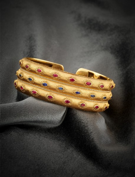 Non mancano i gioielli d’artista, come il bracciale in oro giallo di Cannilla per Masenza (Lotto 237, base d’asta € 7.000), i bracciali in oro puro di Marta Marzotto (Lotto 500, base d’asta € 10.000) e il bracciale scultura in oro giallo firmato Germano Alfonsi (Lotto 242, base d’asta € 3.900). Protagoniste della vendita all’incanto anche le Maison italiane più celebri, tra cui Bulgari, con un anello della collezione Serpenti (Lotto 363), in oro rosa con pavé di diamanti taglio brillante e testa in onice, proposto con una base d’asta di € 8.000. Firmato Mario Buccellati, un raffinato bracciale rigido in oro giallo con apertura a scatto si distingue per le tre volute ornate da rubini e zaffiri taglio marquise su fondo rigato (Lotto 435, base d’asta € 5.000). Pomellato propone invece una collana in oro giallo a doppia maglia piatta, con saliscendi ad asola, che può trasformarsi in bracciale (Lotto 352, base d’asta€ 8.000).