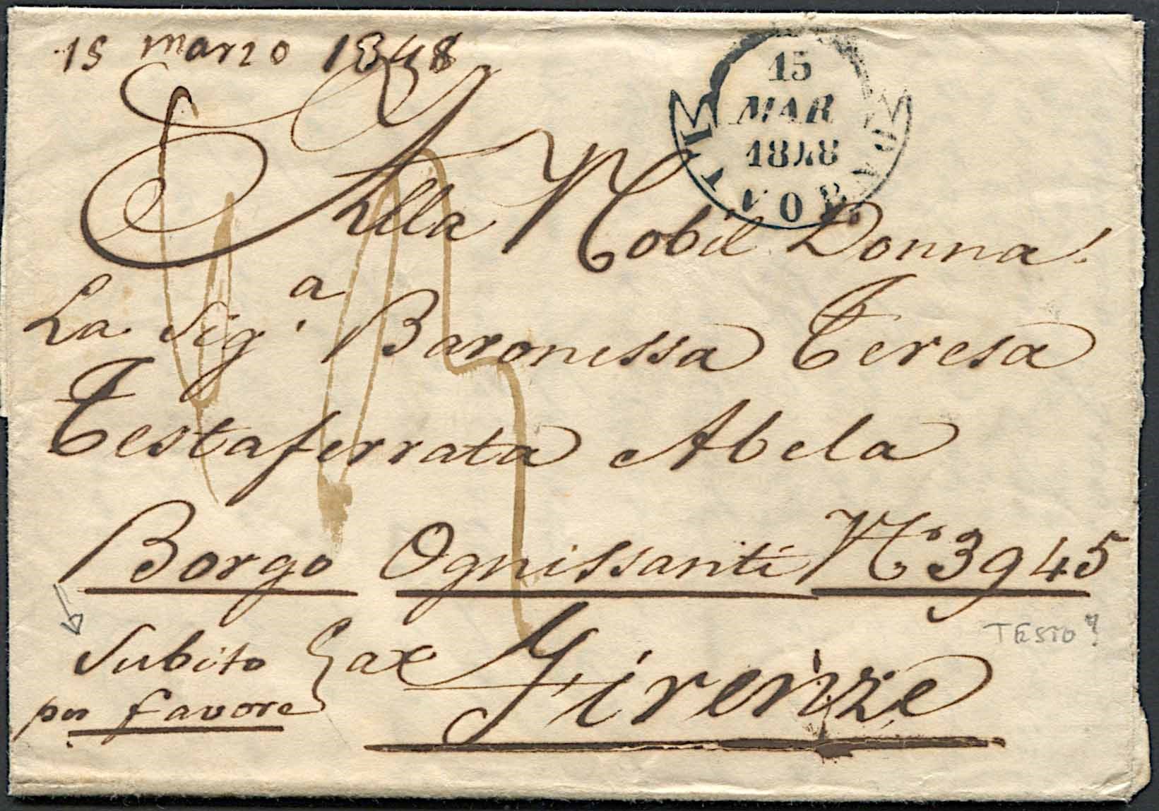 1848, Toscana, prefilatelica da Livorno per Firenza del 15 marzo 1848.