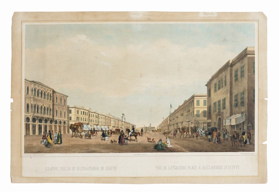 Litografia. mm 452x625. In basso sotto l’immagine a sinistra “J. e G. Fratelli De Andrea dis. dal vero 1852”, al centro “Lit. G. Draghi in Venezia” e a destra “G.B.Cecchini dis. In pietra 1853”. Al margine inferiore titolo in italiano e francese e dedica a Mohamed Seid Pascià. SI AGGIUNGE: Id., Grande Piazza in Alessandria di Egitto / Vue de la grande Place à Alexandrie d’Egypte. Litografia. mm 430x640. In basso sotto l’immagine a sinistra “J. e G. Fratelli De Andrea dis. dal vero”, al centro “Lit. G. Draghi in Venezia” e a destra “G.B.Cecchini dis. In pietra”.