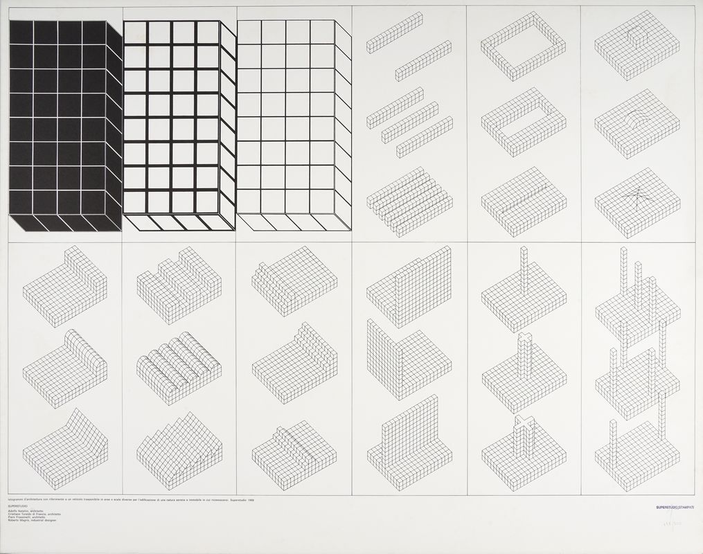 Serigrafia su carta filigranata Fabriano. mm 690x860. Firmata, timbrata e numerata in basso a destra. Es. 458/500. Provenienza: Collezione privata milanese. Gruppo dell’Architettura Radicale, Superstudio inizia una produzione di fotomontaggi che esplicitano l’aspirazione al controllo del mondo naturale e artificiale attraverso un sovramondo caratterizzato dalla presenza di forme geometriche elementari. Allo stesso tempo, queste immagini sono costruite per apparire seducenti e accattivanti, cariche di un forte impatto visivo.