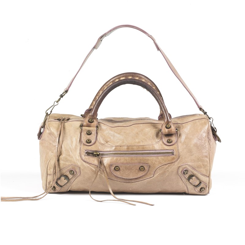 In pelle invecchiata beige con mettalleria in ottone grigio invecchiato, con doppio manico.