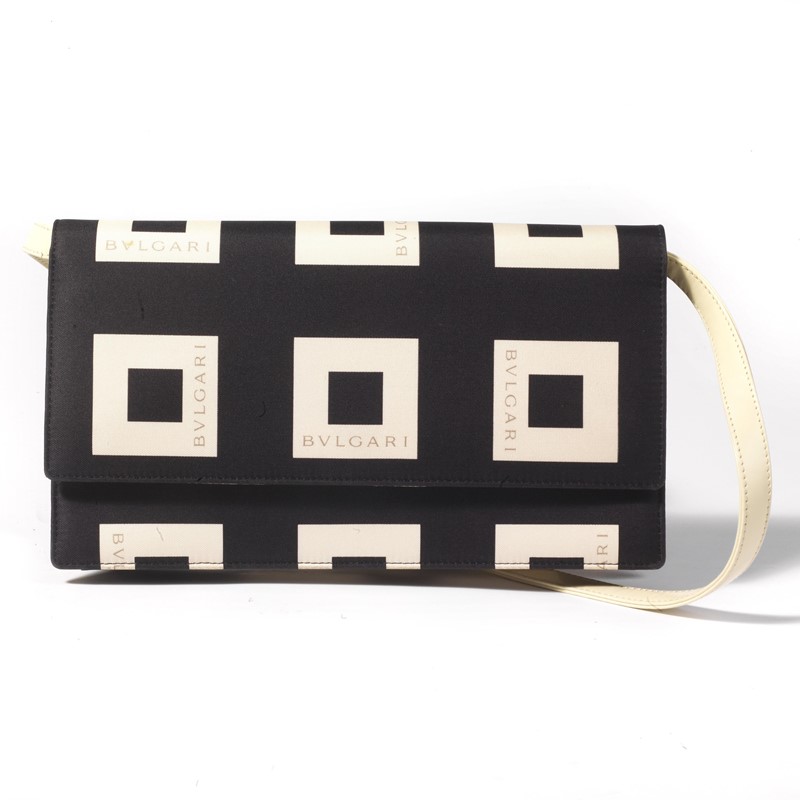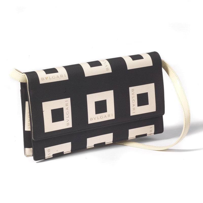 BULGARI BORSA IN TESSUTO CON FOULARD In tessuto a stampa optical con logo tone on tone, con tracolla in pelle bianca. A completare il look, il suo foulard in seta coordinato. Borsa Dim. cm 22X13X3 Foulard Dim. cm 90x90