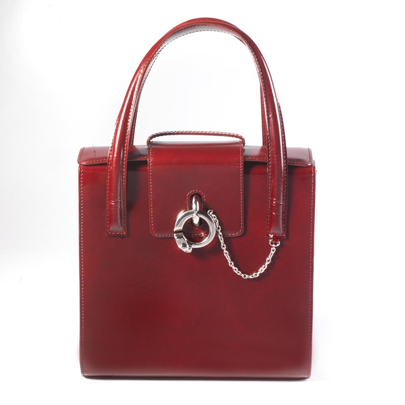 In pelle bordeaux, di costruzione rigida con doppio manico e chiusura in ottone con caratteristica forma Panther. Corredata di tracolla staccabile.