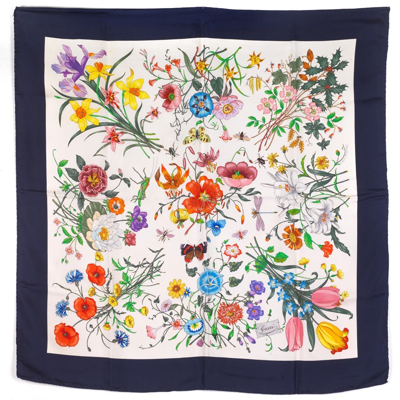 In seta 100% con stampa Flora su base bianca e cornice blu. Non può mancare in ogni armadio!