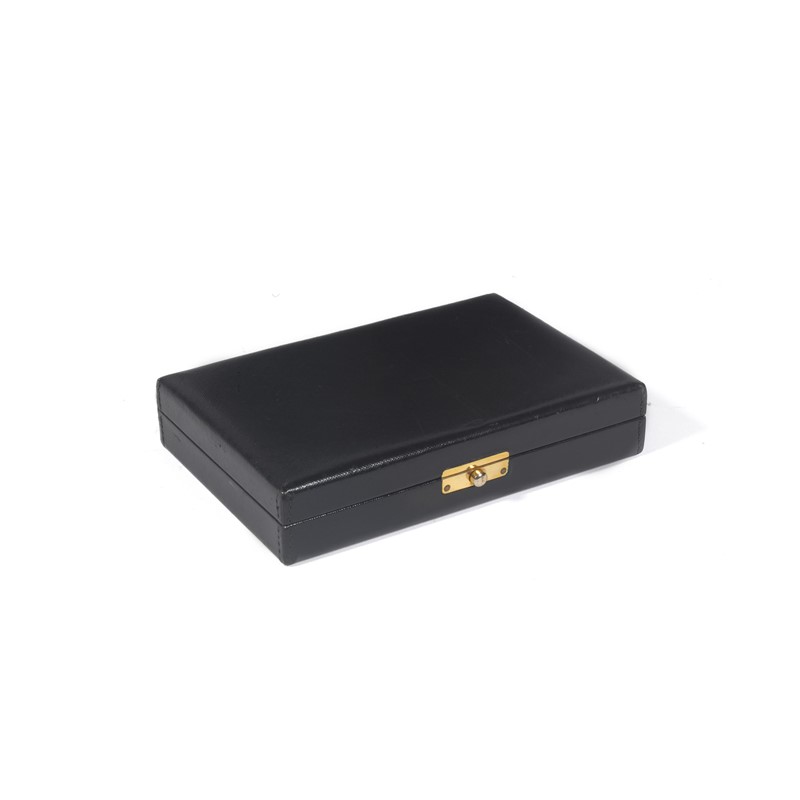 Struttura rigida, in pelle marrone scuro con chiusura in ottone ed interno in camoscio beige con logo in oro.