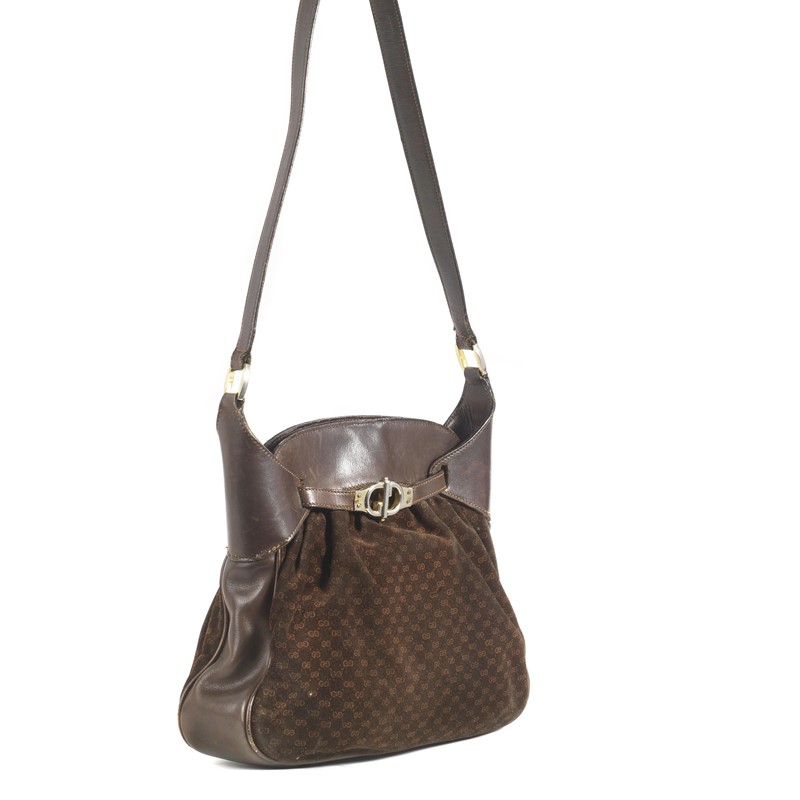 GUCCI TRACOLLA MINI GG In camoscio marrone con stampa mini GG, questa tracolla nella tipica forma a hobo, ha la tracolla e le rifiniture in pelle marrone, come i laccetti che tengono il logo vintage in ottone bicolore, argento e oro, sulla parte frontale. Dim. cm 32x27x7