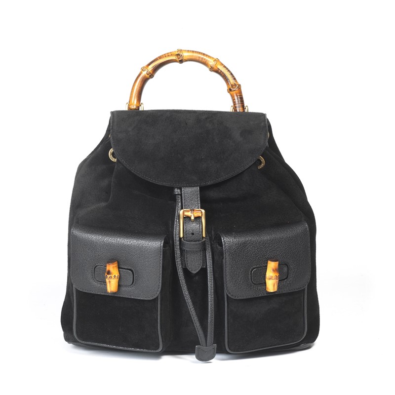 GUCCI ZAINO BAMBOO MEDIO In camoscio nero con base, retro e tracolle aggiustabili in pelle; fodera diamante e taschina con zip e tiralampo con logo. Metalleria in ottone invecchiato; doppia tasca esterna con nottoli in bamboo, come anche il manico. Dim. cm 30.5x30x10