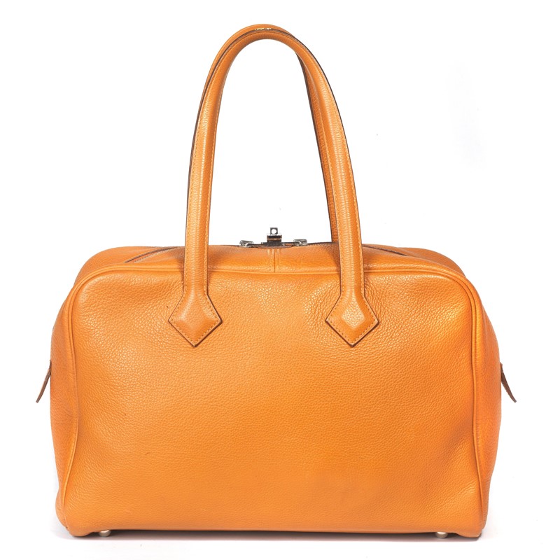 HERMES BAULETTO VICTORIA II 35 In pelle Clemence arancio caldo, colore che rappresenta la Maison, bauletto comodo con doppio manico per stare anche a spalla, zip di chiusura con doppio cursore in metallo argento, fodera in tessuto e tre tasche interne. Corredata di lucchetto e chiavi originali. Dim. cm 35x22x16