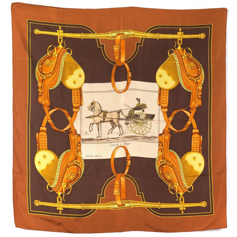 In seta 100% nei caldi toni del marrone castagna, con selle in color oro ben dettagliate ai quattro angoli del foulard. Stampa realizzata da Philippe Ledoux nel 1953.