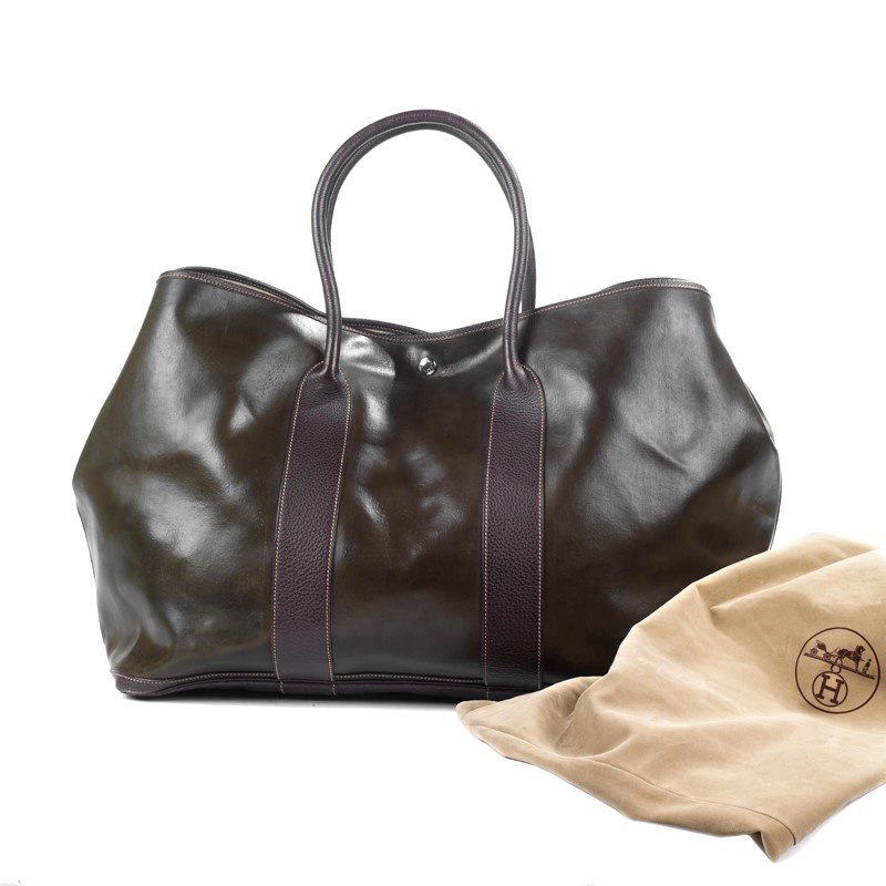 HERMES GARDEN PARTY SHOPPING BAG in morbida pelle liscia marrone scuro con cuciture a contrasto, doppio manico e fasce centrali in pelle togo bordeaux, fodera in lino e chiusura con bottone a pressione riportante logo Hermès esternamente, dettagli in metallo color palladio. Con dustbag originale. Dim. cm 50x35x24