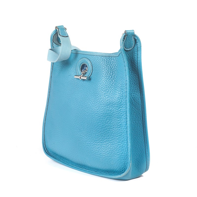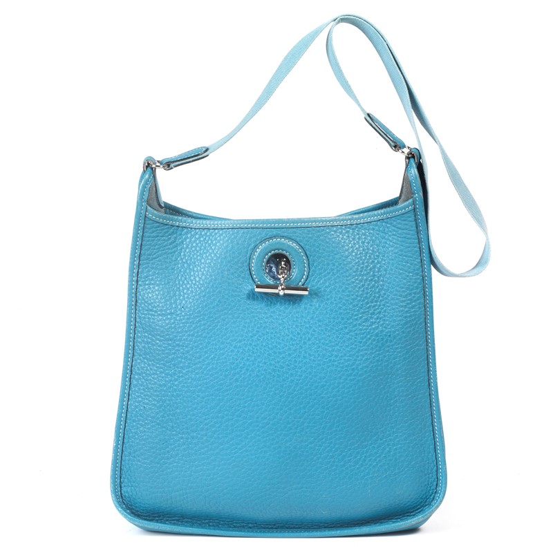 HERMES TRACOLLA VESPA BAG In pelle Clemence azzurra, per uno stile sportivo e chic, tracolla morbidissima completamente sfoderata con chiusura in ottone color argento e tracolla in nastro tono su tono. Corredata di dust bag originale. Dim. cm 25x25x7