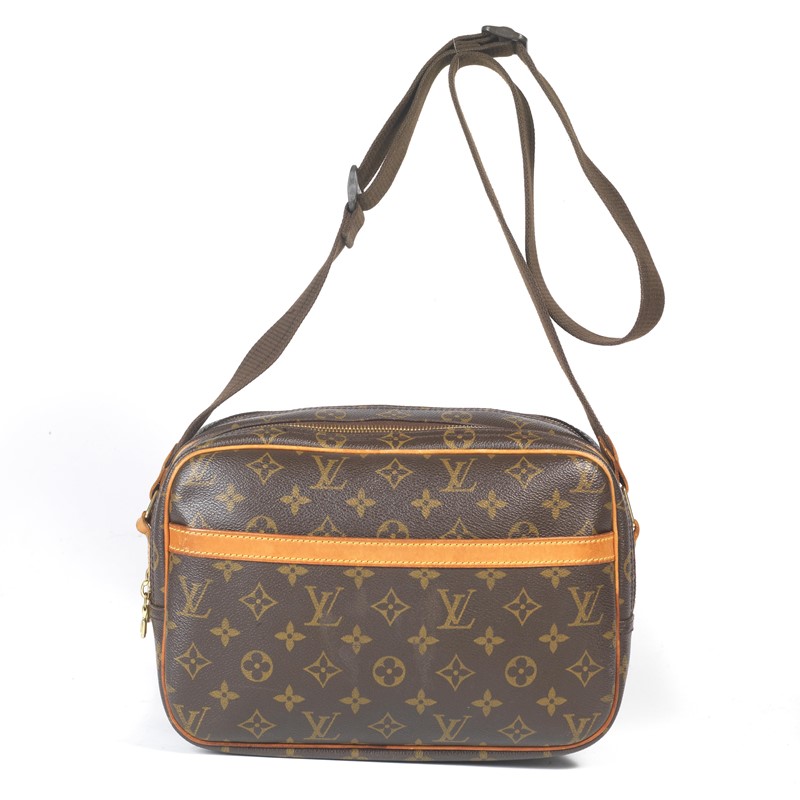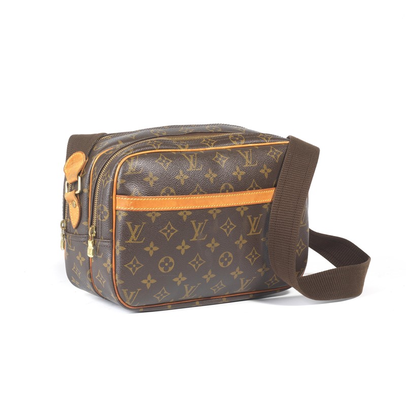 In tela Monogram con rifiniture in vacchetta e tracolla in nastro aggiustabile. Doppio interno con chiusure con zip e tiralampo in ottone con logo. Tasca esterna aperta.