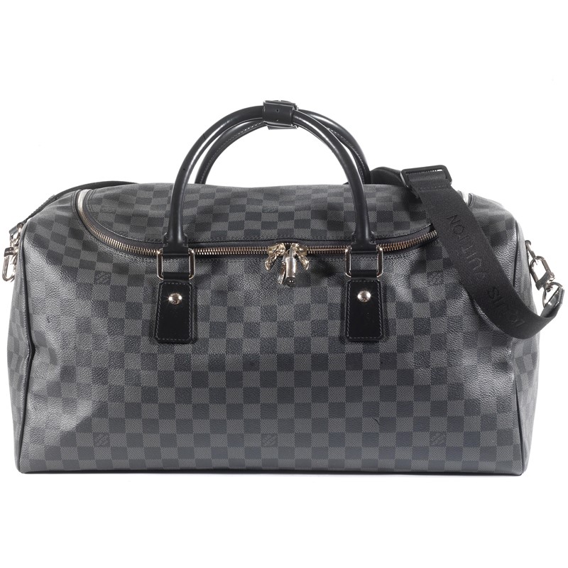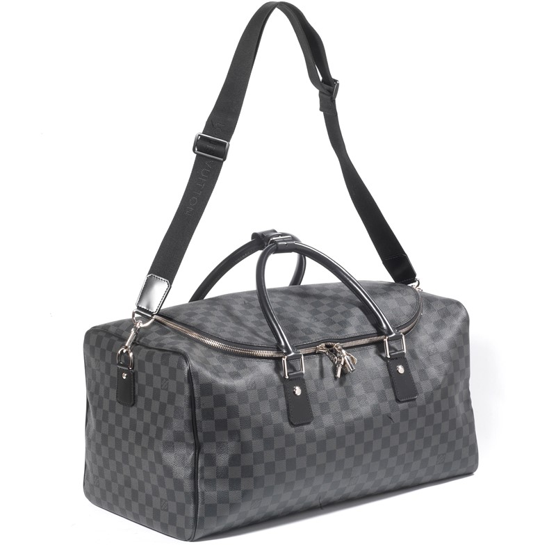 LOUIS VUITTON KEEPALL DAMIER 45 BANDOULIERE In tela Damier graphite, con metalleria in ottone logata e fodera in tessuto cotone, chiusura zip a doppio cursore, formato cabina. Corredata di lucchetto, chiavi, dust bag e tracolla staccabile. Dim. cm 45x27x20