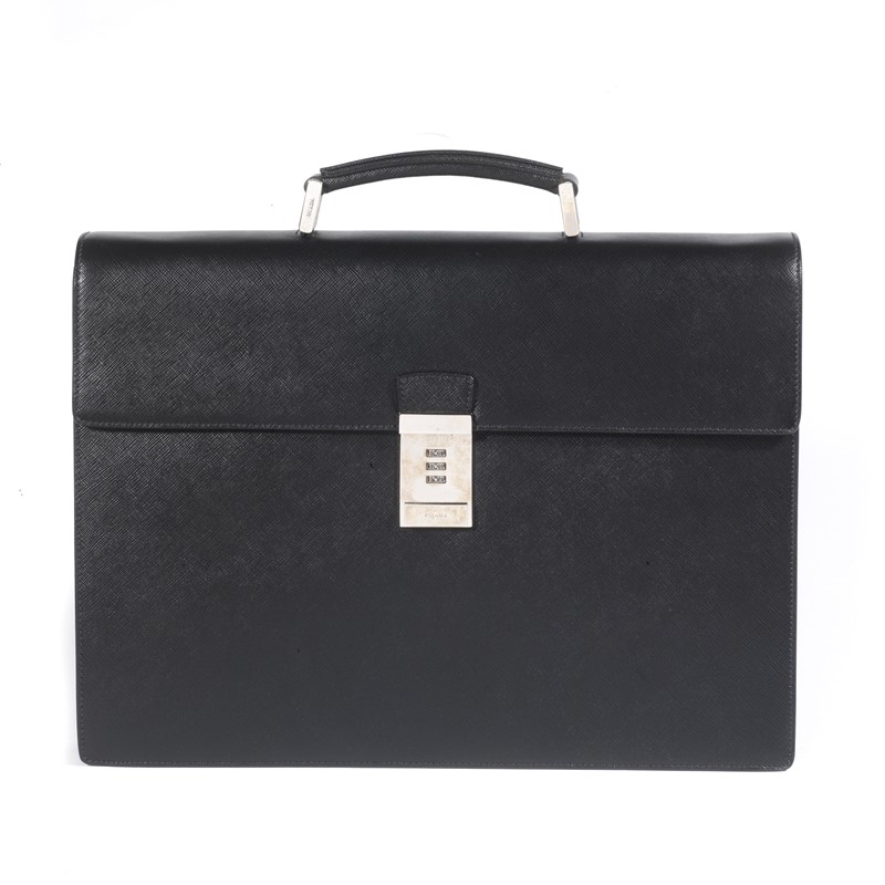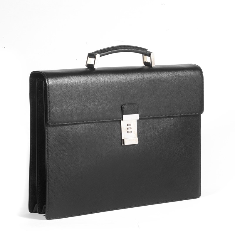 In pelle saffiano nera, valigetta con doppio soffietto e chiusura logata in metallo con combinazione; una maniglia in pelle e tasche interne organizzate.
