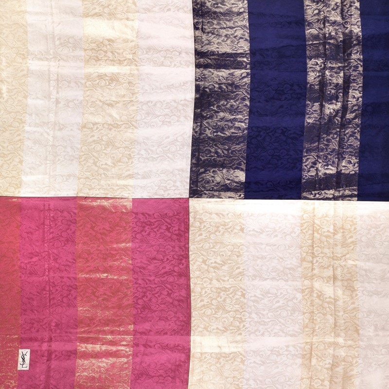 Ampia stola in tessuto jaquard lamé, con riquadri crema, rosa e blu. Logo YSL su un angolo.