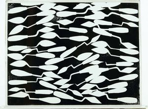 Smalto su tela, cm. 70x50 1973 Firma e data in basso a destra. Sul verso: firma, data e titolo. Timbro di [..]