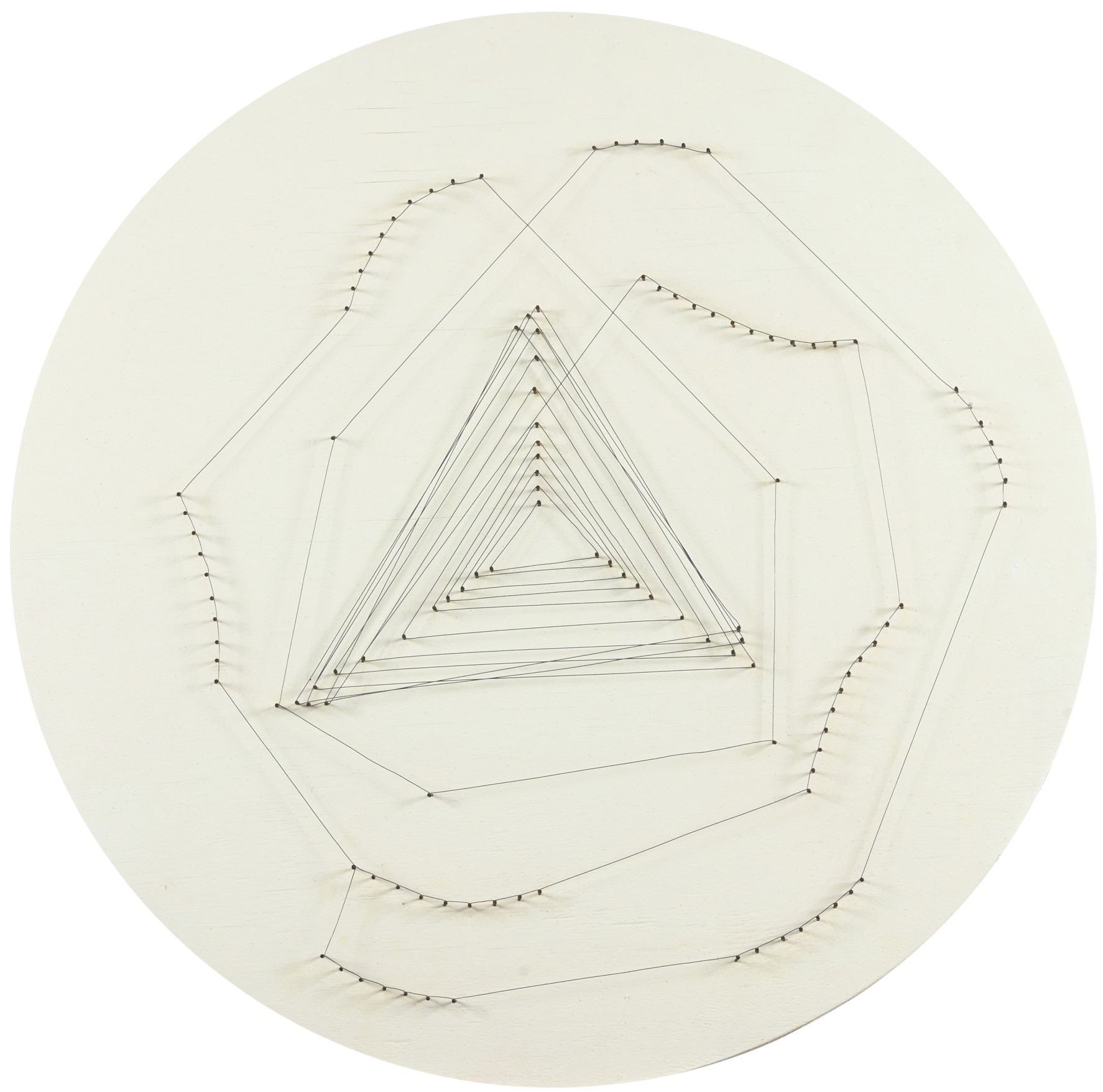 Chiodi e fili su tavola dipinta, diam. cm. 55