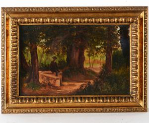 Scuola italiana, fine XIX secolo Paesaggio boscoso con figura