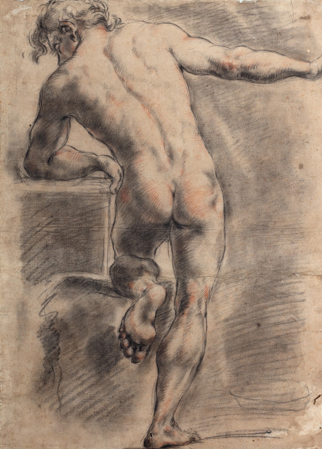 matita nera, biacca e acquerello rosa su carta bruna, mm 443 x 320