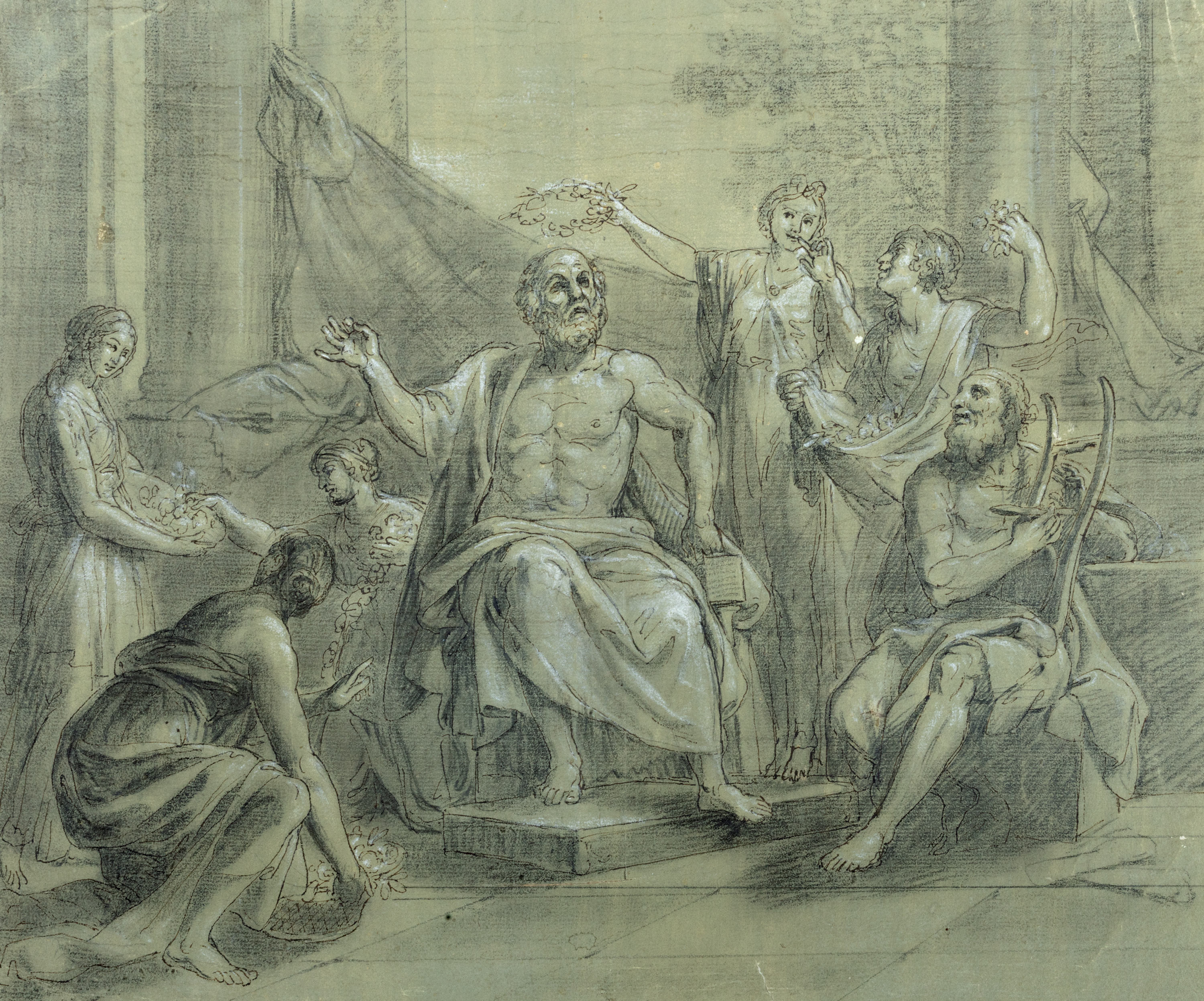 penna e inchiostro bruno, matita nera e biacca su carta preparata azzurrina, mm 320 x 387
