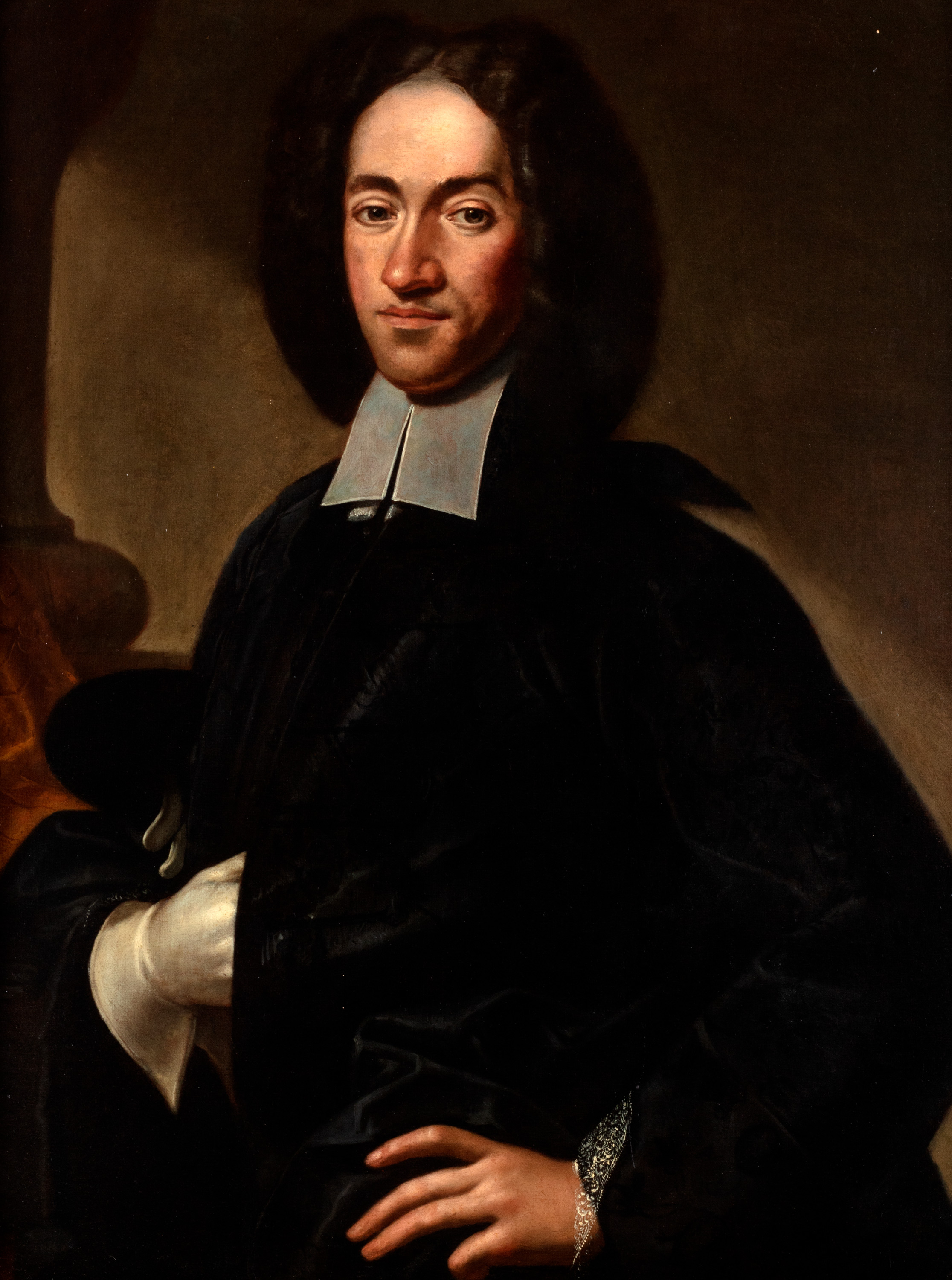 Ritratto di gentiluomo a mezzo busto, in abito scuro damascato