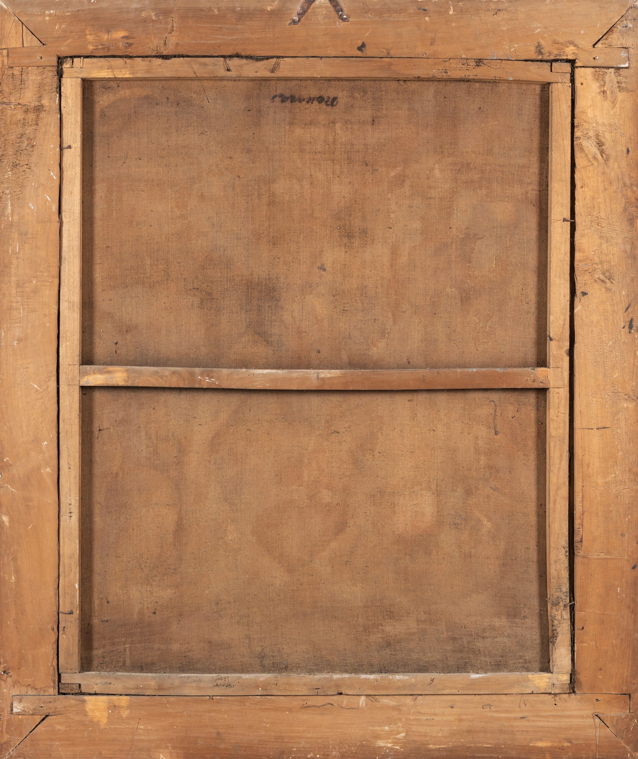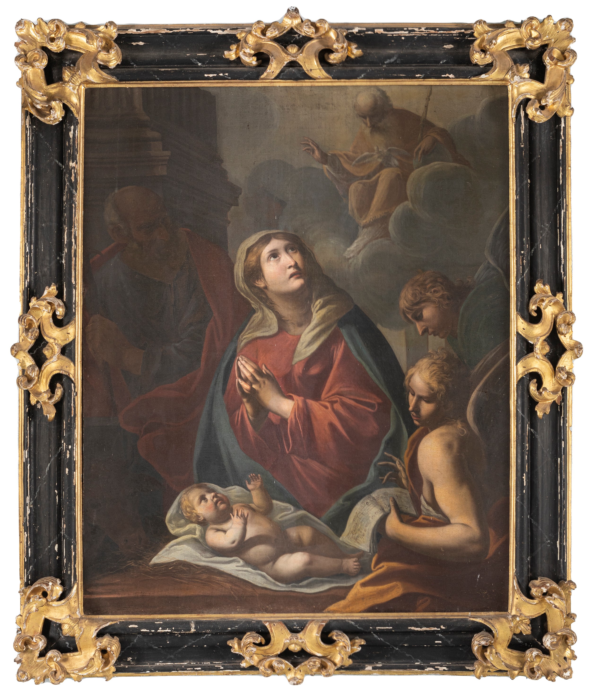 in cornice coeva in legno ebanizzato con fregi intagliati e dorati