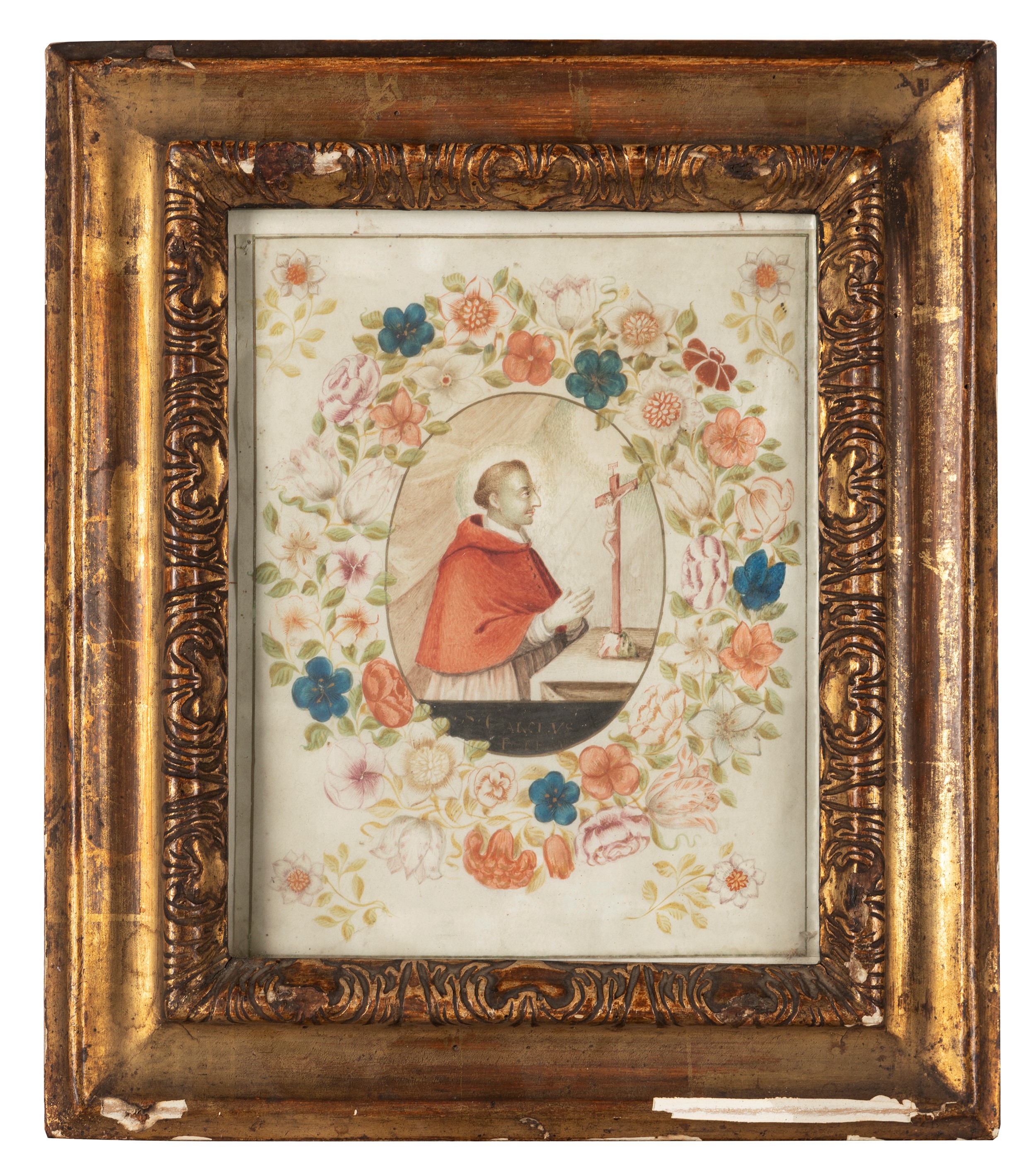 San Carlo Borromeo in adorazione del crocifisso, entro ghirlanda di fiori