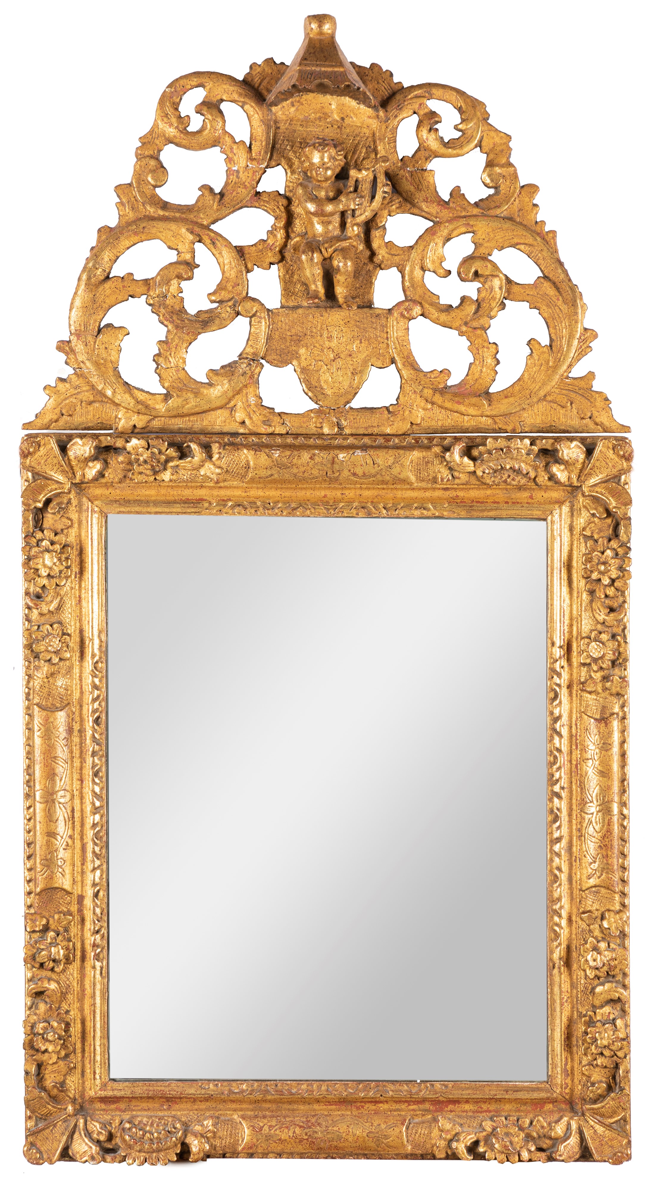 parte inferiore dorata e intagliata a motivi floreali; sormontata da un frontone dorato, traforato e riccamente intagliato con motivi vegetali e nicchia al centro con putto musicante