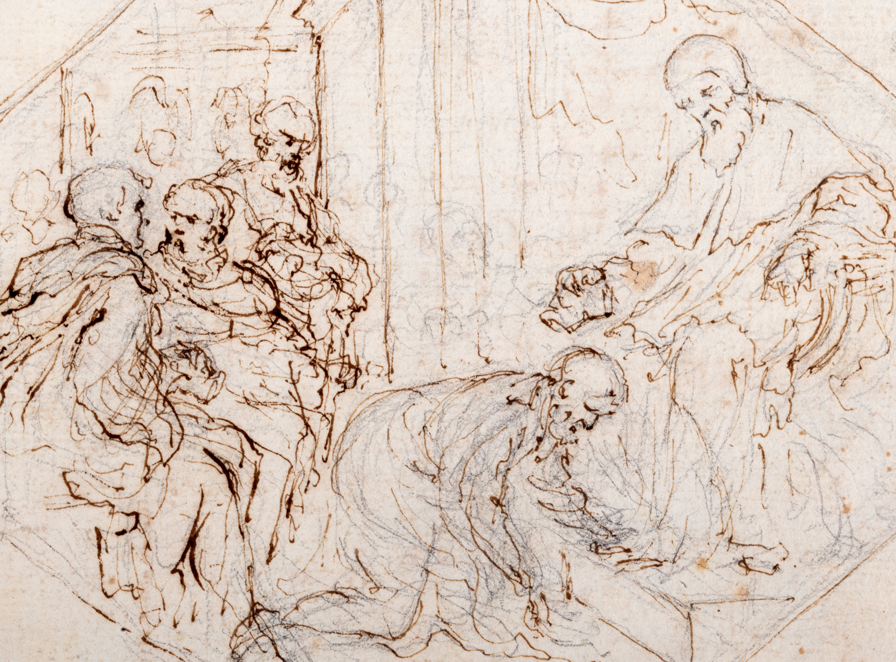matita grigia, penna e inchiostro bruno su carta (entro sagoma ottagonale), mm 130 x 174