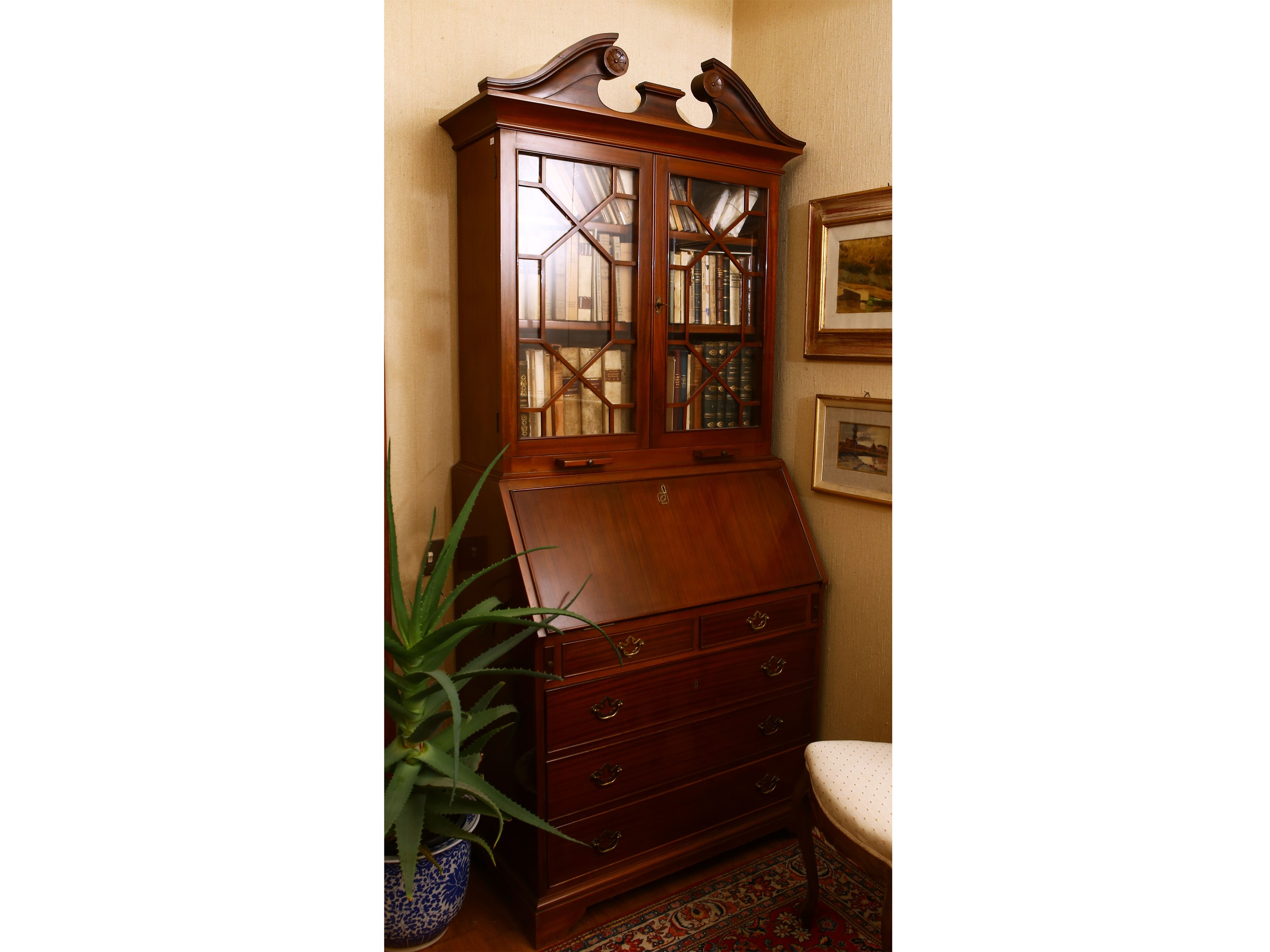 h cm 216x88x50 Inghilterra, XX secolo cimasa a timpano spezzato, due sportelli a vetro con cornici geometriche, due tiretti, parte inferiore con sportello a calatoio a celare scarabattolo con vani e cassettini, due mezzi cassetti ed altri tre a tutto corpo sottostanti, piedi a mensola
