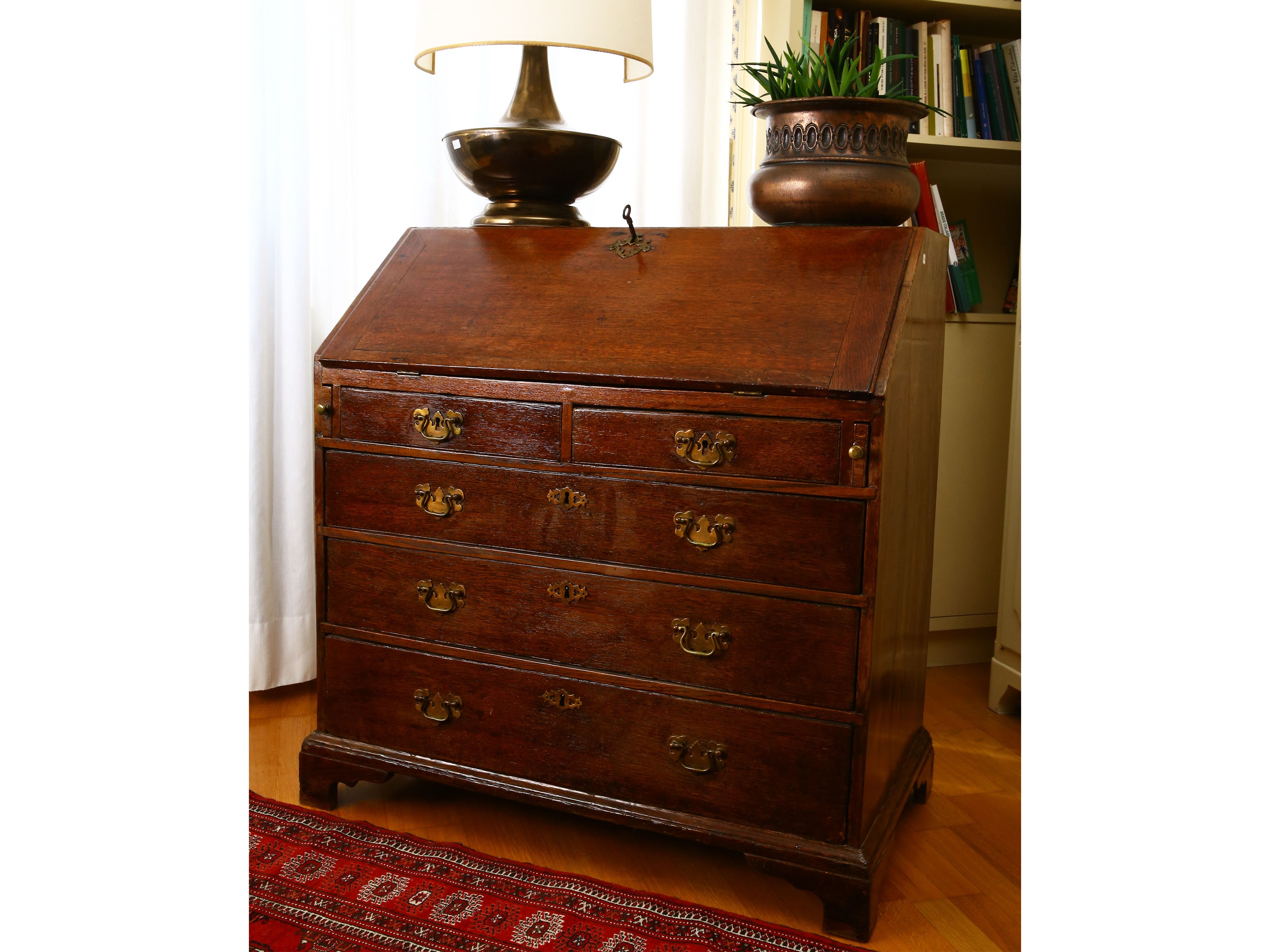 Inghilterra, prima metà del XX secolo sportello a calatoio a celare scarabattolo con vani porta oggetti e sportellino, due mezzi cassetti nella fascia e tre sottostanti a tutto corpo, piedi a mensola, alcuni difetti