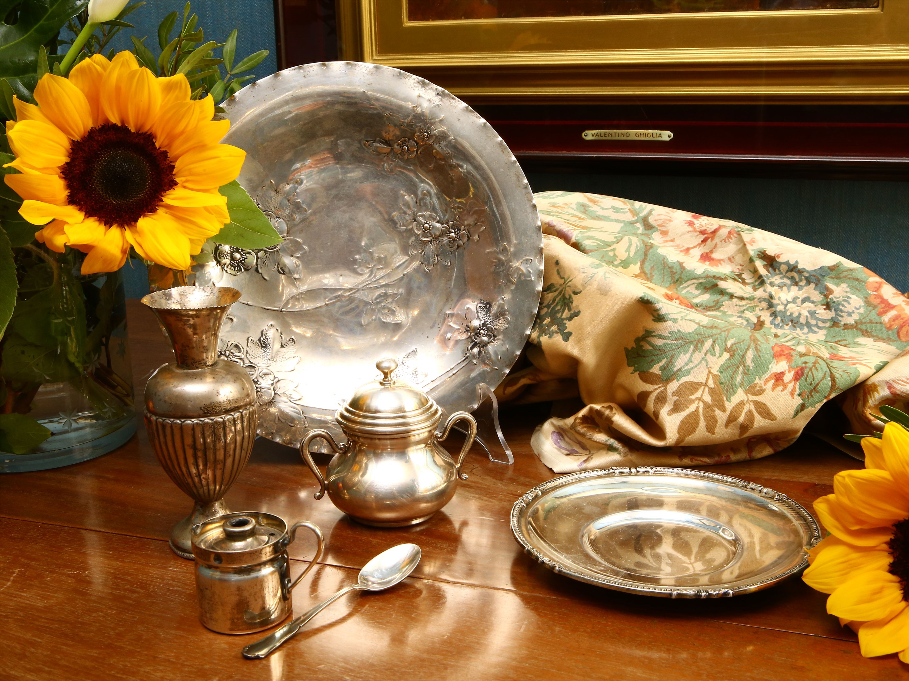 gr 720, vassoietto diam cm 25 (6) MIlano. Anni Trenta sbalzato con motivi floreali, su tre piedini mossi, abbinato ad una piccola zuccheriera con piattino e cucchiaino, ad un vasetto con corpo parzialmente baccellato, e ad una piccola lattiera Brandimarte, alcuni difetti