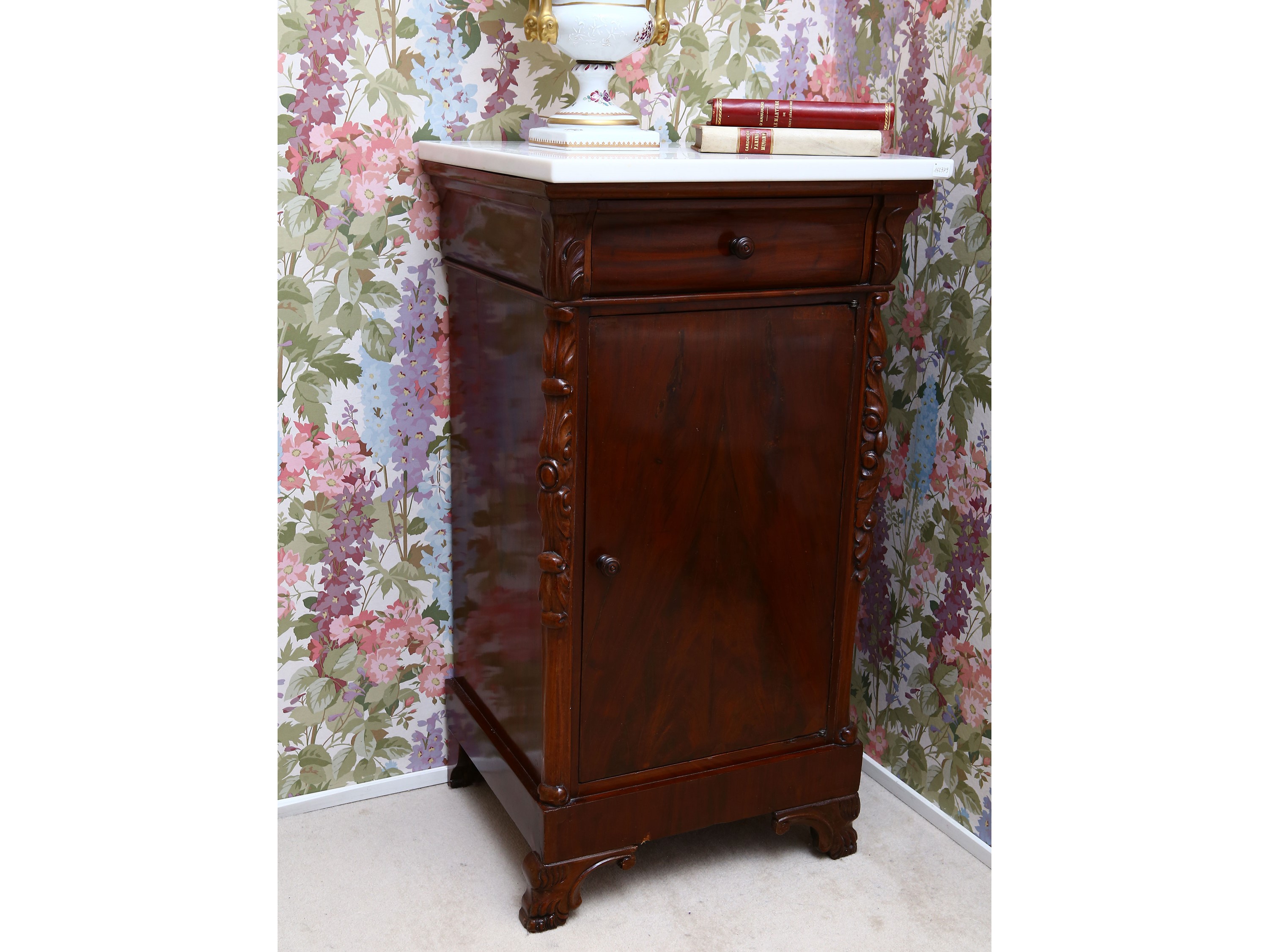 seconda metà del XIX secolo un cassetto sotto il piano, sportello sottostante, lese intagliate a motivi vegetali, piano in marmo bianco di epoca posteriore