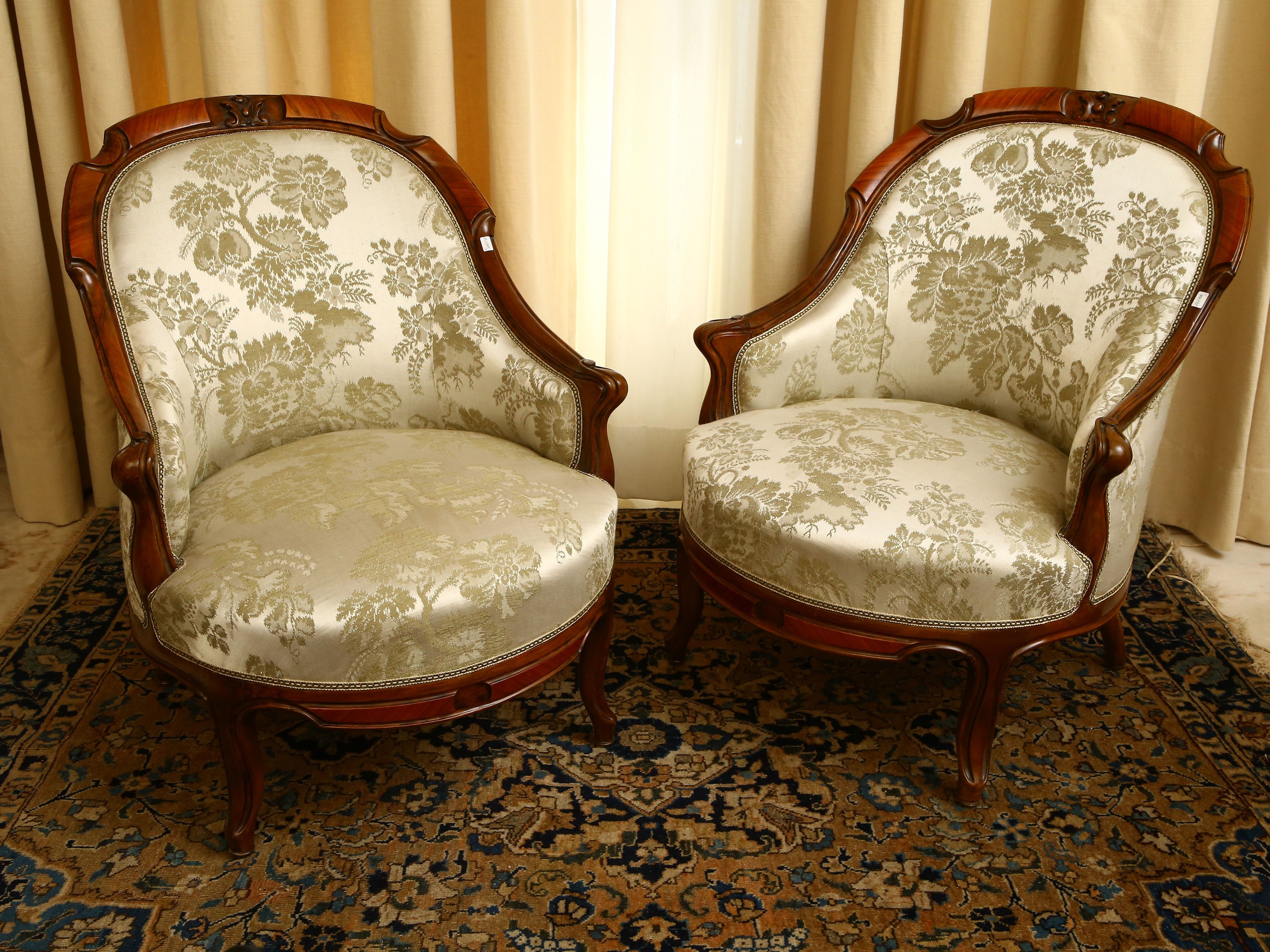 h cm 77 seconda metà del XIX secolo schienali avvolgenti con braccioli desinenti a ricciolo, gambe anteriori mosse, sedili arrotondati, imbottite e rivestite in tessuto damascato bianco con opera floreale verde