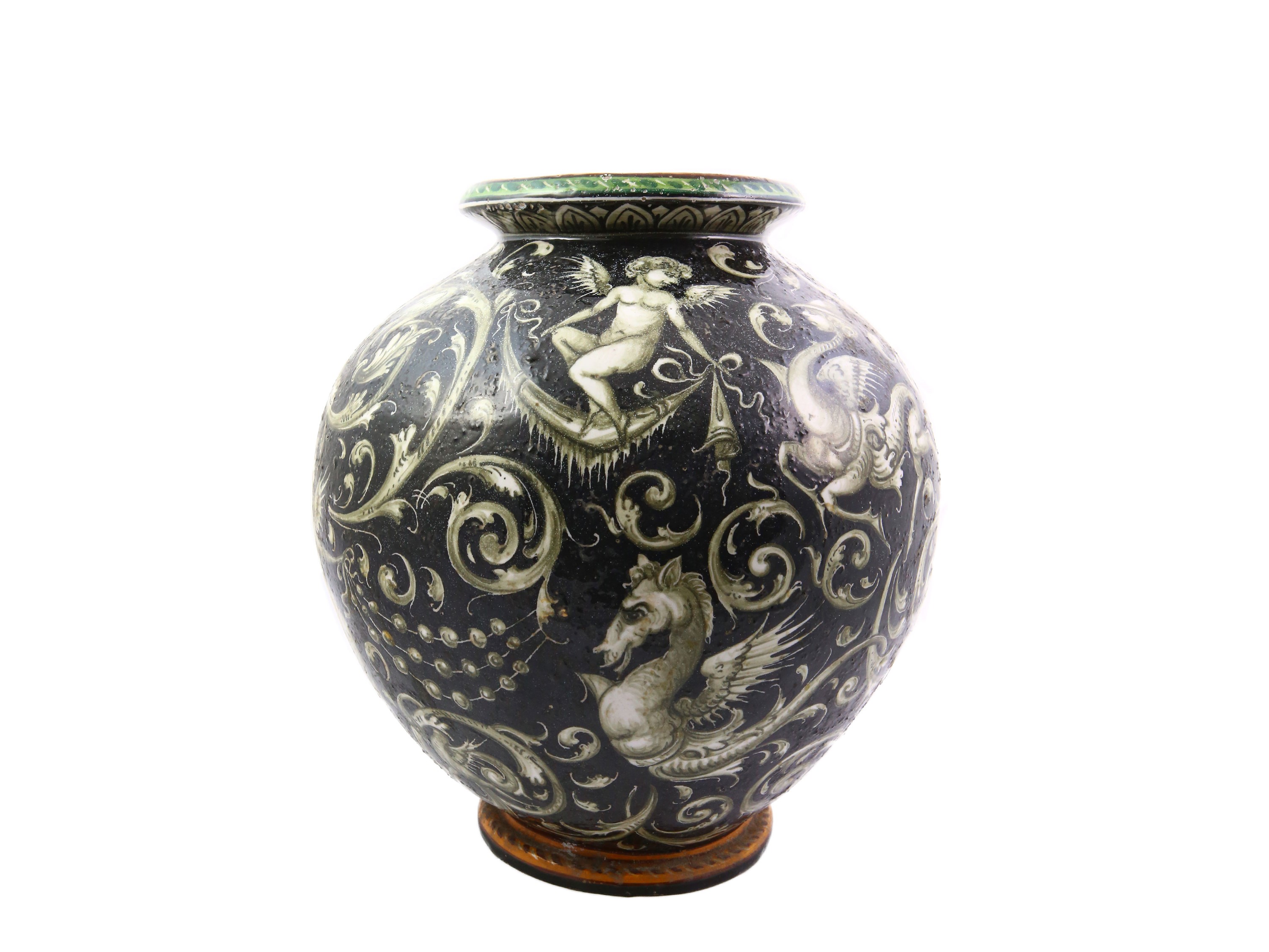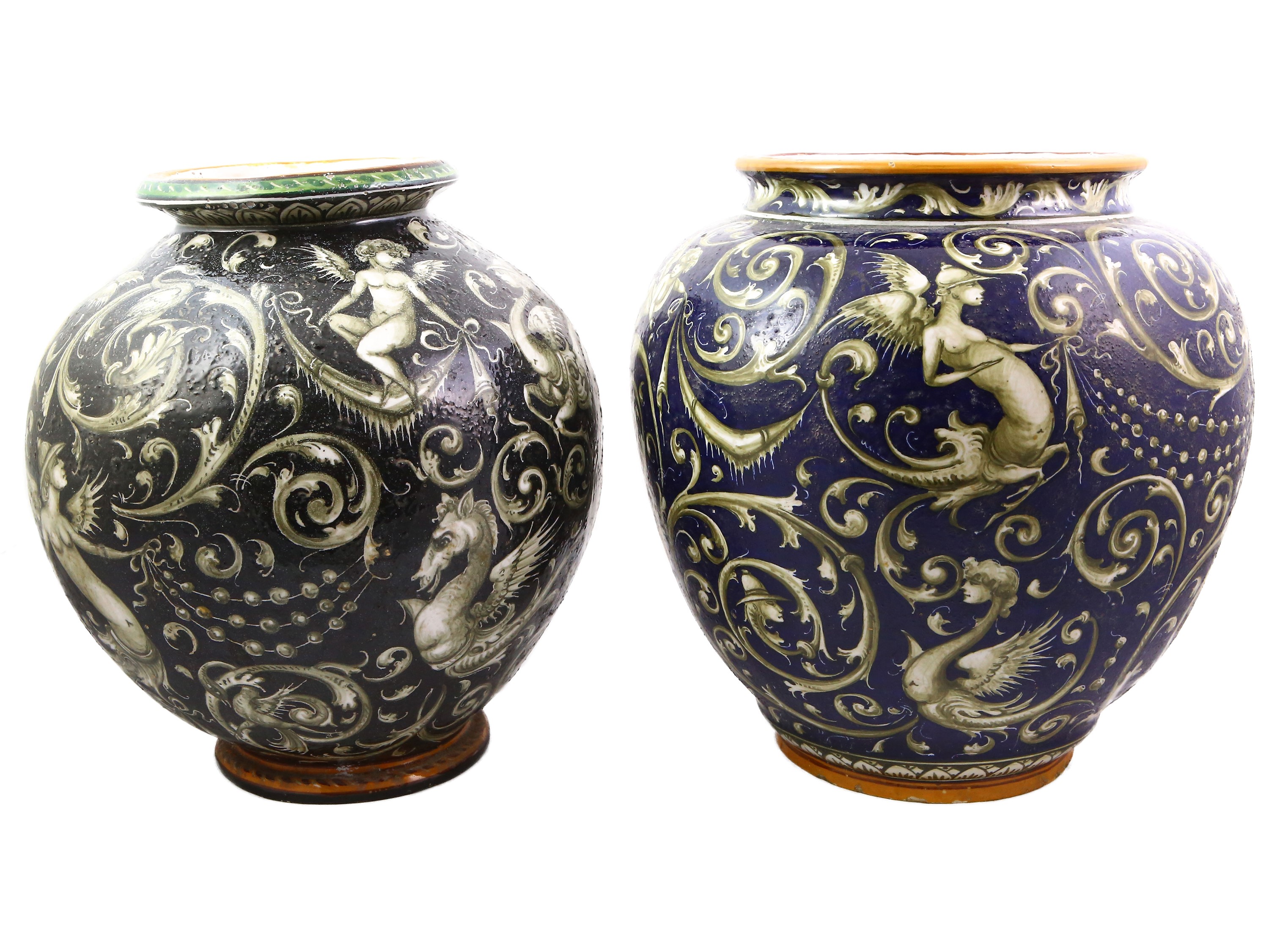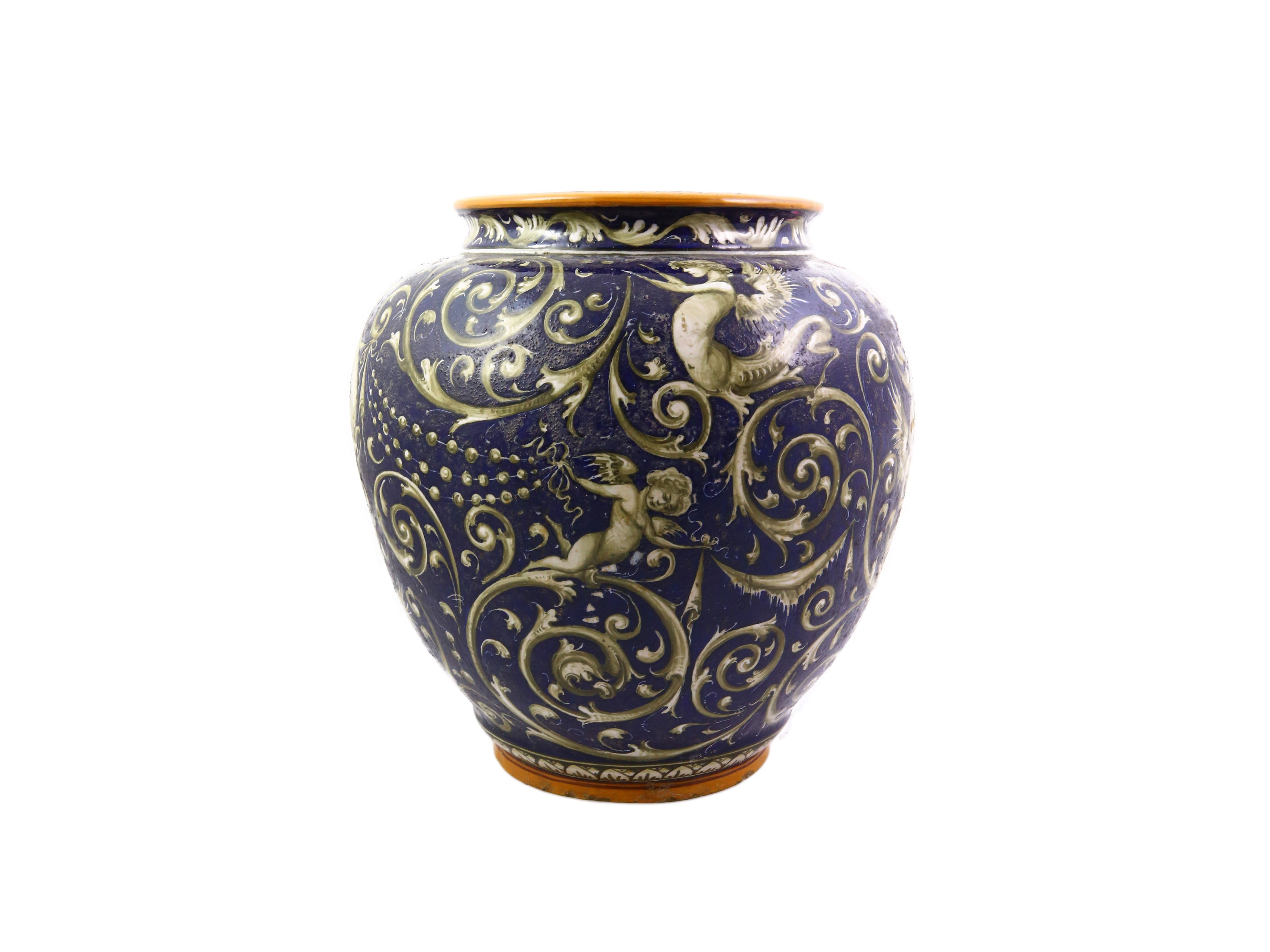 Pesaro, 1924-1934 di forma globulare, dipinti con motivi a grottesche monocrome su fondo blu, difetti