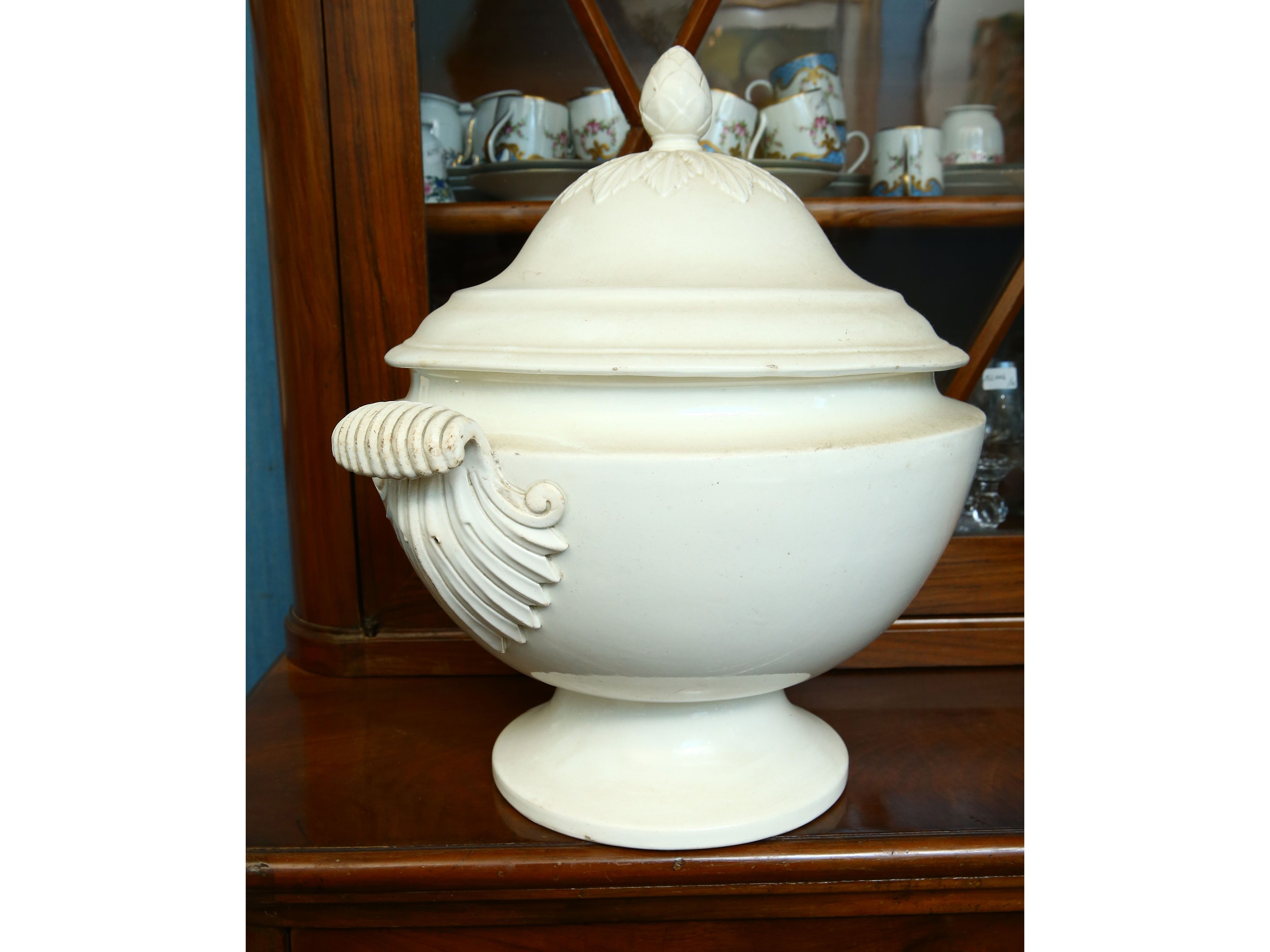 probabilmente Veneto, inizio del XIX secolo di gusto Impero, coperchio a cupola con grande presa a pigna con attacco con ghirlanda di foglie di alloro, due prese modellate come conchiglie desinenti a ricciolo