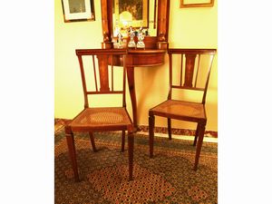 Inghilterra, XX secolo cartella traforata centrata da intarsio a vaso, sedute in paglia di Vienna, lievi dife [..]