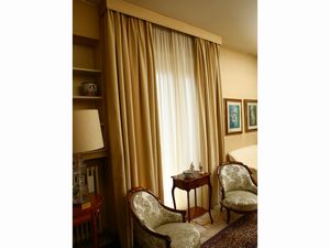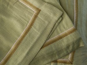 h cm 270x225 circa seconda metà del XX secolo ornate ai lati con passamaneria spigata beige e color senape, difetti [..]