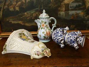 h cm 33, h cm 34 Pesaro, 1924-1934 di forma globulare, dipinti con motivi a grottesche monocrome su fondo blu, [..]