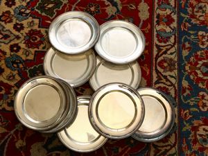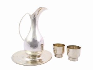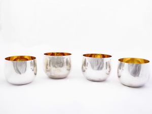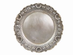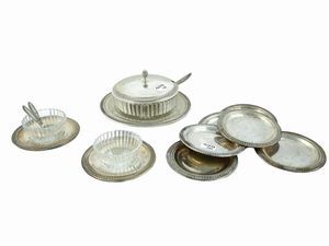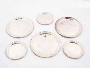 gr 720, vassoietto diam cm 25 (6) MIlano. Anni Trenta sbalzato con motivi floreali, su tre piedini mossi, abbinato [..]