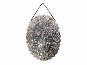 cm 34x25 Sud America di forma ovale, bordo smerlato, rivestito completamente in metallo argentato cesellato con [..]